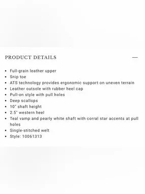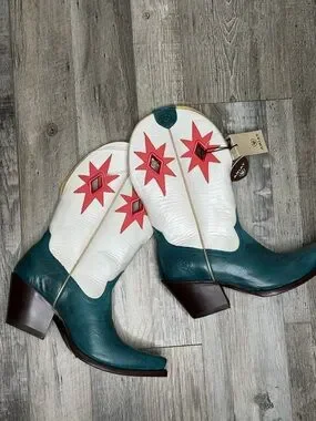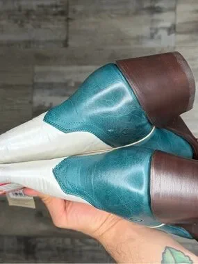 Eye-catching teal leather shaft with white vamp. Classic western stitch detailing on the shaft. Smooth leather construction and pull tabs. Sleek pointed toe and stacked heel.