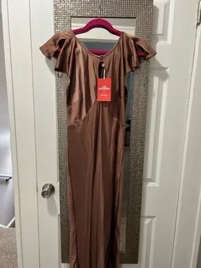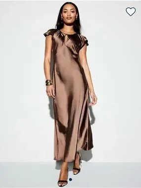 Satin maxi dress with short flutter sleeves. Keyhole neckline with A line silhouette. Good quality satin and very flattering. Purchased for wedding but never worn.