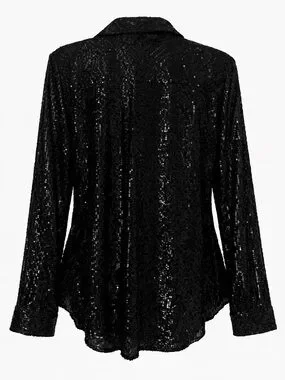 Glamorous black sequin button-down blouse. Classic collar with full-length sleeves. Has snaps, Shimmering all-over sequin finish. Tailored silhouette for polished wear. Ideal for evening or party looks. Worn 1x 🩷💚🩷
