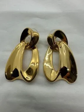 Statement sculptural drop earrings with a luminous gold-tone finish. Smooth, fluid shapes catch the light. Post backs for secure wear. Classic metallic style for dressy looks.