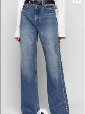 High-rise wide leg jeans with a relaxed, slouchy fit. Light blue denim with silver stud embellishments along seams and pockets. Classic five-pocket style. Edgy yet wearable for everyday looks. Some graying on the bottom back of the jeans. Pictured.