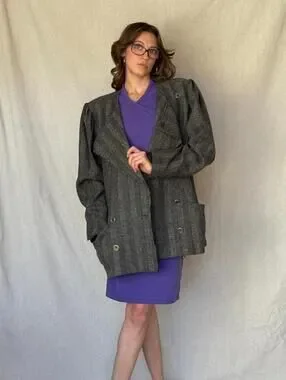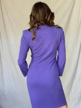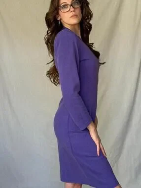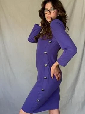 Vintage 80s purple bodycon dress with the cutest heart-shaped faux buttons up left side, padding in shoulders that could be easily removed if desired
