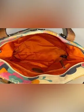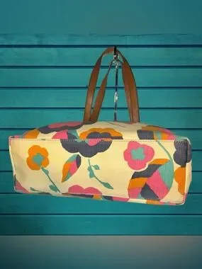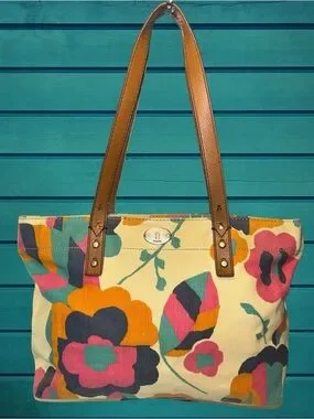 Fossil Cream Canvas Tote with Multicolor Floral Print and Brown Leather Handles