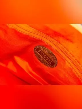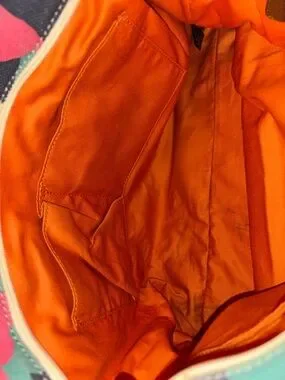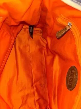Fossil tote in cream canvas with bold floral print. Features multicolor blooms in pink, orange, teal, and navy. Brown leather handles with rivet detailing. Spacious and eye-catching for daily use.