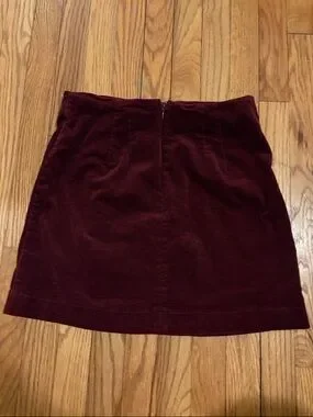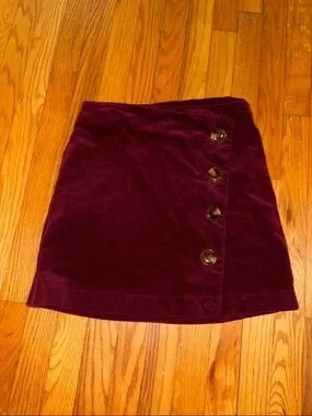 Soft velvet mini skirt with a diagonal button-front detail. Rich burgundy hue offers elevated everyday style. Pairs easily with sweaters or blouses.