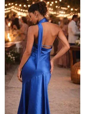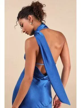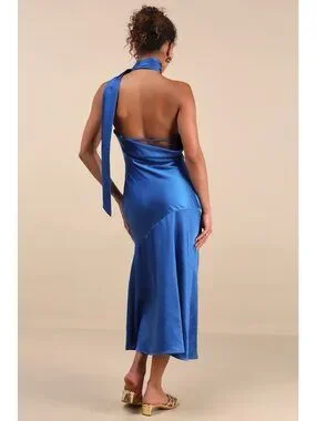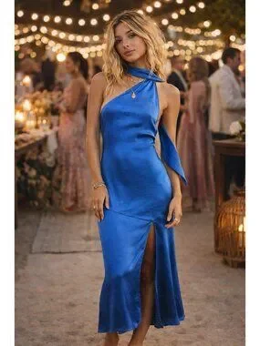 Lulus Womens Reglan Sash Midi Dress Sz Medium Blue Satin One Shoulder Low Back