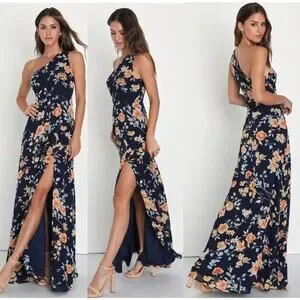 Lulus Elegant Admiration Navy Blue Floral One-Shoulder Maxi Dress Party Medium
