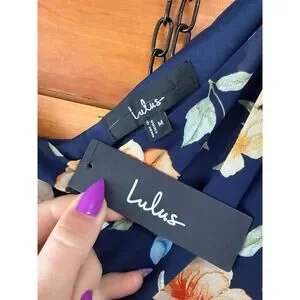 NWT Lulus Elegant Admiration navy blue floral maxi dress, size M. Features a one-shoulder neckline, sleeveless bodice, and a flowy A-line silhouette. Side slit adds movement and elegance. Hidden back zipper.