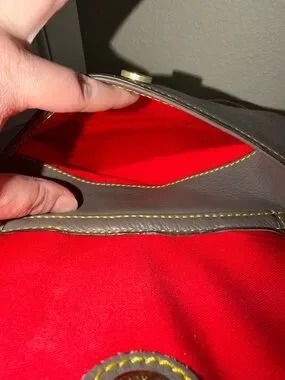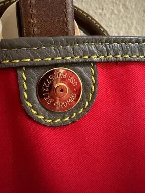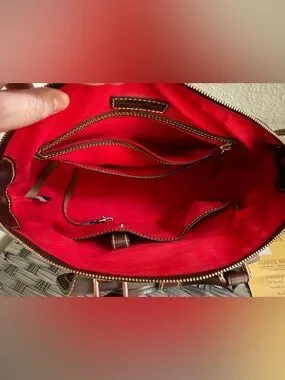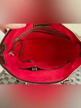Dooney & Bourke satchel in a beautiful gray/taupe pebbled leather with rich brown trim and signature contrast stitching. Features the iconic front flap with logo lock medallion and a vibrant red cotton interior.