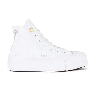 Durable woven cotton upper with rubber sole. Lace-up front. Hints of embroidery throughout for a DIY-style design. Felt All Star ankle patch. Rubber toe cap. Reimagined license plate. Approx 45mm/ 1.75 inch platform.