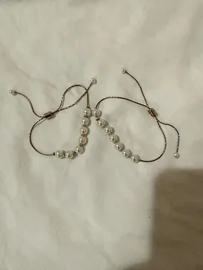Elegant adjustable bracelet featuring white faux-pearl beads on a gold-tone braided cord. The sliding clasp allows a custom fit. Perfect as a standalone piece or stacked with other bracelets.