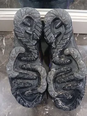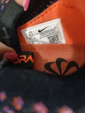Sporty Nike knit sneakers. Black upper with purple and pink woven speckles. Bright orange inner lining and tongue detail. Lace-up design with subtle blue side speckling. Super cute and comfy shoes. Could use a good cleaning🩷
