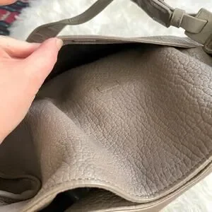 Very good pre-owned condition. This bag has a couple of small flaws. A couple of minor marks on leather, scuff on bottom of bag, and minor discoloration on underside of the strap (not seen when worn). Interior is in great condition. This bag looks amazing when in use!