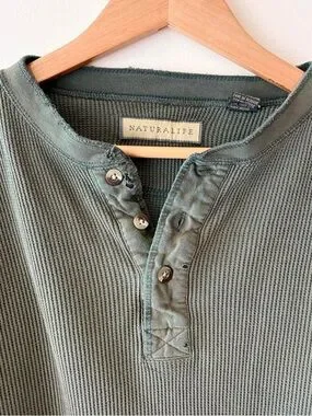 Vintage 90s grunge skater distressed henley button waffle knit shirt green L-XL