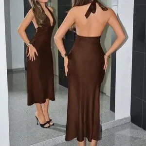 Turn heads in this brown Y2k backless party dress, designed with a sleek halter neckline and a high waist that accentuates a slim fit silhouette. The long, flared hem adds movement and drama, while the deep backless detail brings a modern edge. Perfect for evening events, the dress combines vintage Y2k flair with contemporary style, making it an eye‑catching choice for any celebration where you want to stand out.