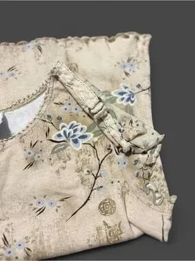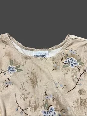 Featuring a beautiful golden-tan base, it is layered with a faded blue floral motif and traditional Chinese calligraphy throughout. The signature lettuce-edge (ruffled) hem and sleeves add that authentic vintage texture everyone is looking for.