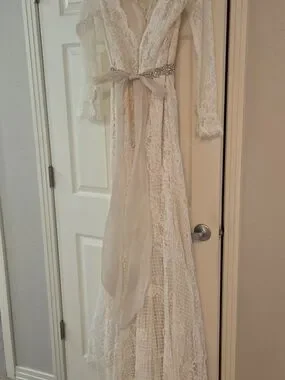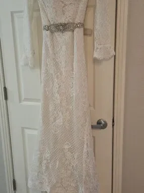 DISCONTINUED - This sleeved boho wedding dress is comprised of allover lace, with sheer lace comprising the long sleeves, bell cuffs, V-back, and V-neckline. Sheath silhouette lined with York jersey for a luxe feel. Finished with covered buttons and zipper closure.