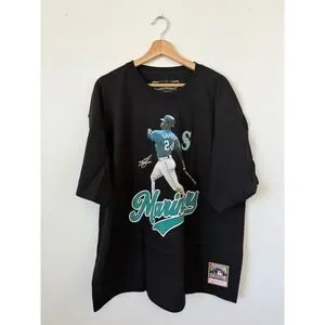 NWT Mitchell & Ness Seattle Mariners Ken Griffey Jr. Emerald tee in black. A must-have for fans, this graphic tee is stylish, comfortable, and perfect for casual wear or game day.
