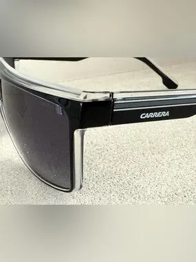 Bold oversized sport shield style with black frame, dark lenses, and signature Carrera logo detailing. Super cool Y2K / racer vibe.