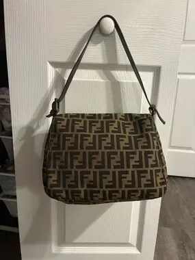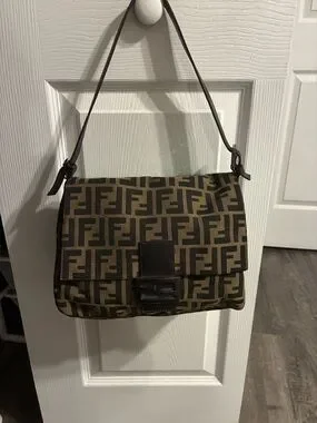 Fendi messenger bag in signature FF canvas. Dark brown leather strap and flap with FF clasp. Structured silhouette for daily use. Timeless designer pattern and subtle hardware.