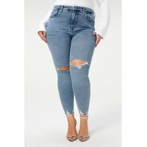 The ultimate high rise waist-shaper, the Good Waist. This classic jean is updated with a two knee distressing and chewed hems. This pant comes complete with a five pocket style, zip fly button closure, ultra high rise, knee rips, a chewed hem, all in the perfect medium blue wash.