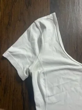 Soft white V-neck short sleeve top with a flattering fitted silhouette. Lightweight, breathable fabric for all-day comfort. Easy to dress up or down for versatile wear.