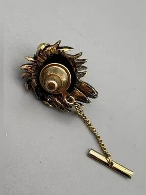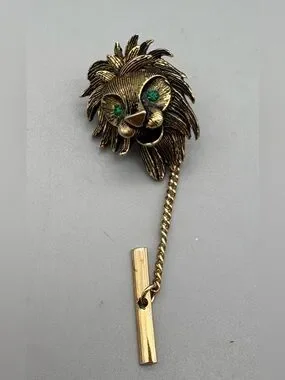This is a vintage gold tone Lion's Head Tie Tack Lapel Pin with Green rhinestone Eyes. It measures about 1” tall and is in good condition. Please see photos for details.