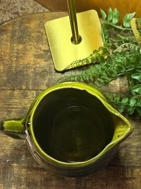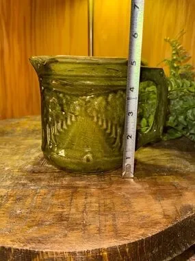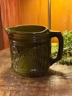 Looking to add a touch of vintage charm to your kitchen? Look no further than this Brush McCoy Water Pitcher. With its classic design and beautiful glaze, it's the perfect piece to display or use for serving drinks at your next gathering. 5” tall.