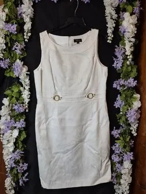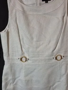 Classic sleeveless sheath dress in a textured white fabric. Features a defined waist with gold-tone buckle accents. Sleek, tailored silhouette for a polished look. Versatile for professional or dressy occasions.