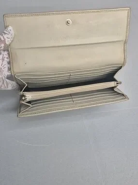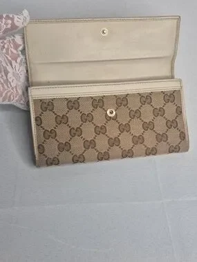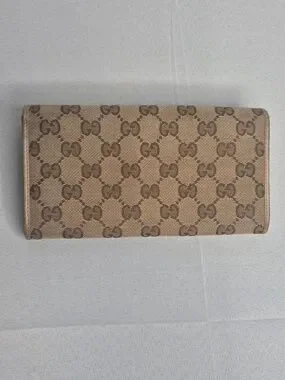 EUC Gucci continental wallet in GG Supreme canvas. Features signature green-red web stripe with gold-toned logo button. Classic beige and brown colorway for versatile styling. Organized interior layout ideal for daily use. Has been professionally cleaned and conditioned inside and out. Will throw in unbranded chain strap. Has some rubs, tarnishing and minor marks.