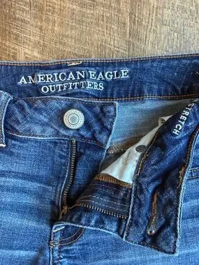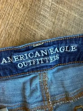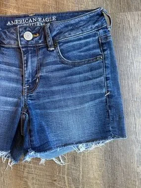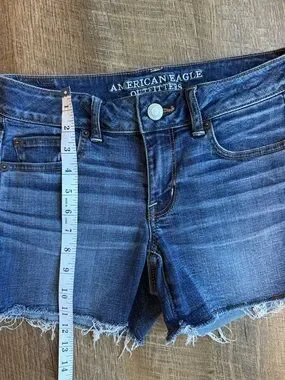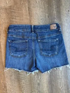Classic American Eagle denim shorts. Distressed frayed hem. Medium blue wash with subtle fading. Five-pocket style with zip fly.