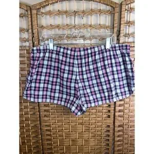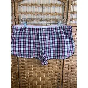 The product is a pair of Y2K Aerie brand boxer shorts in a plaid pattern, designed for women in size XL. The shorts feature a pink, black, and white color scheme, making them a stylish and comfortable choice for sleepwear. With their retro Y2K aesthetic and brand quality, these shorts are a trendy and cozy addition to any woman's sleepwear collection.
