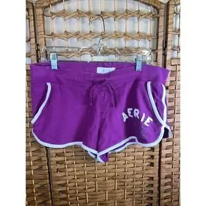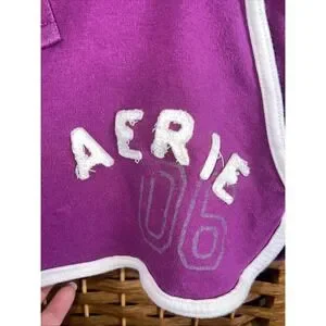 The product is a pair of vintage Aerie juniors size large sweat athletic shortie purple shorts. Made from cotton, these hot pants feature the Aerie logo as accents. Perfect for teens, these shorts in a stylish purple color offer a comfortable and trendy option for casual wear.