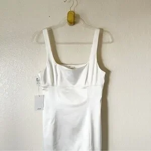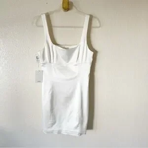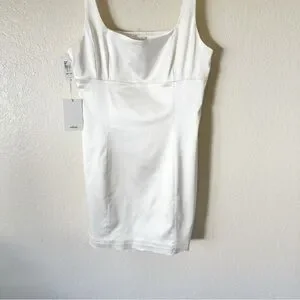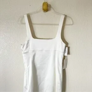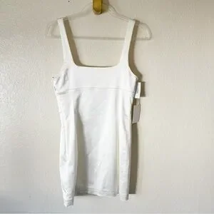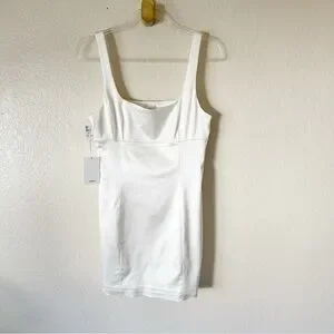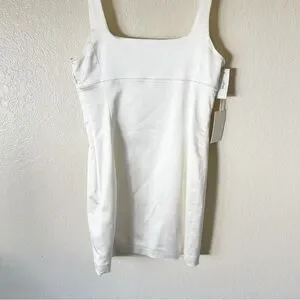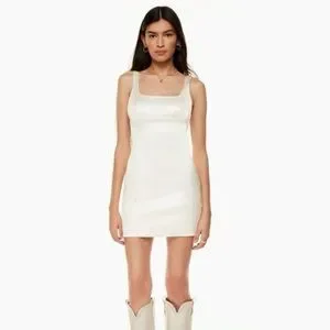 Fitted mini dress with a square neckline. Tank straps and clean seams. Smooth, body-skimming silhouette. Simple and versatile for many occasions.