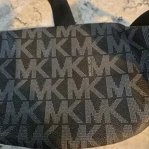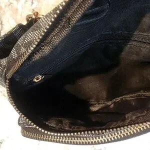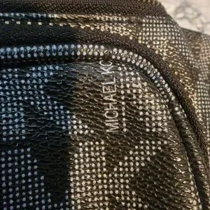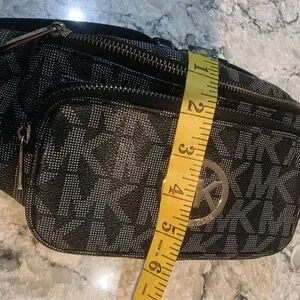 Compact Michael Kors belt bag with signature MK jacquard. Front zip pocket and top zip closure. Adjustable strap for hands-free wear. Gold MK medallion adds luxe detail. This is a pre-owned belt bag still in good condition. call outs are wear on hardware as seen in pictures and thread issue as seen in pictures. It is still a really good bag, with lots of life left.