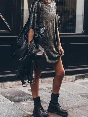Deep Grey Grunge Streetwear Nian Short Sleeve Mini Dress
