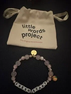 Delicate pink bead stretch bracelet featuring 'FRESH START' letter beads. Soft pink stones paired with gold accents create a feminine look. Lightweight and easy to wear for everyday styling. Peach charm included. Never worn, bag included. Size S/M.