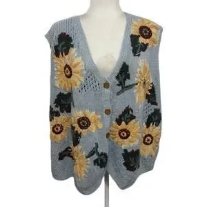 Vintage Sunflower Knit Sweater Vest Cottagecore Floral Button Front Oversized 90s