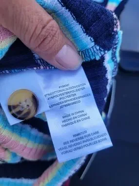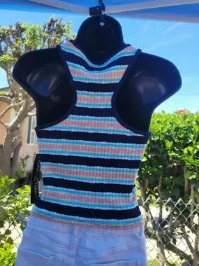 Ribbed knit tank with button-front closure. Features horizontal black stripes alternating with pastel pink, blue and green bands. Scoop neckline and sleeveless cut for casual layering.