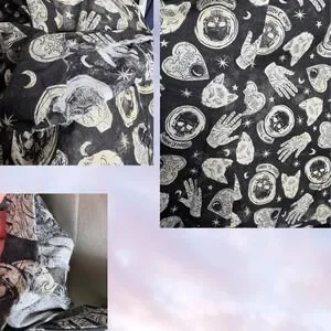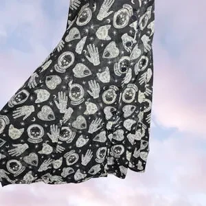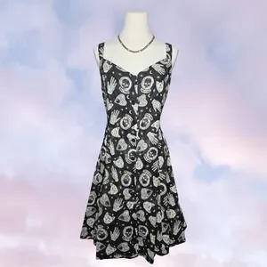 Handmade Black Ouija Board Witchy Vampy Gothic Celestial Summer Spaghetti Dress. Cutest handmade v-neck tank midi dress with ouija board planchette, cats, palmistry hands, magic ball, skulls, moons and stars all throughout. Cute gothic piece to beat the heat in