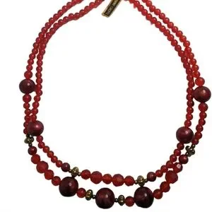 Turn heads with this stunning vintage double-strand necklace featuring vibrant red Genuine Lucite beads. The necklace showcases smooth and faceted beads in rich translucent tones, accented with gold-tone spacers for extra dimension and shimmer.