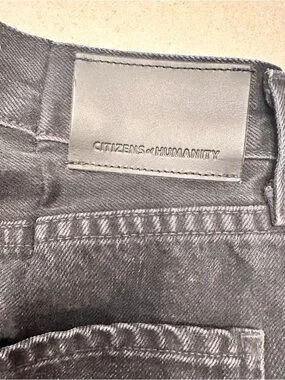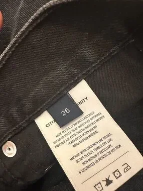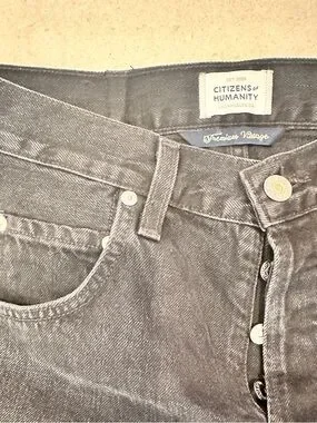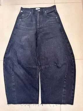 Citizens of Humanity high-rise barrel denim with classic five-pocket styling. Subtle faded wash for lived-in character. Wide barrel style, button-fly closure, raw hem and tonal stitching. Clean, stylish and versatile look. EUC