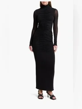 A ruched-to-fit dress features sheer sleeves and a head-turning aesthetic.