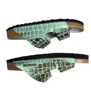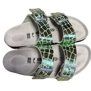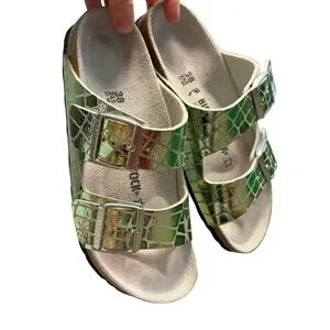 Birkenstock Arizona Gator Gleam two-strap comfort sandal in a green metallic finish. Size 38 / 7 Only worn once.