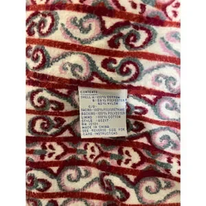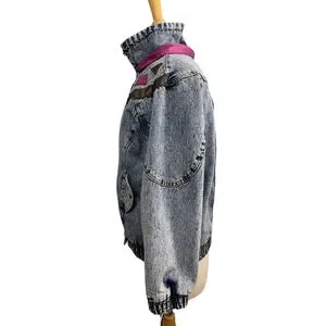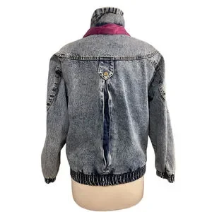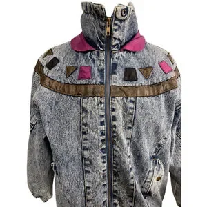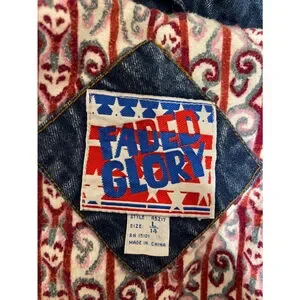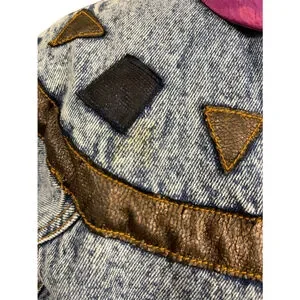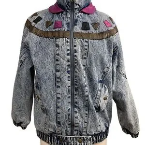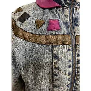 This is a pre-owned Vintage Faded Glory denim jacket, size L/14, made in China. It features a blue acid wash denim exterior with a brown leather trim and geometric patches. The jacket has a full-zip closure, a stand-up collar with a purple satin lining, and a ribbed waistband and cuffs. The jacket has a few minor imperfections, including some fading and wear on the denim and leather trim. Overall, the jacket is in good condition and is a great vintage piece.