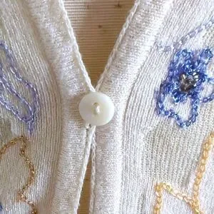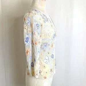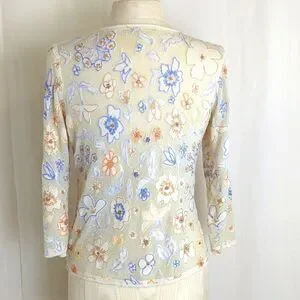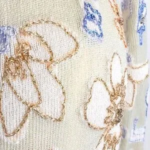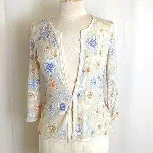 Cute tan cardigan lightweight sweater with embroidered flowers, some in metallic threads