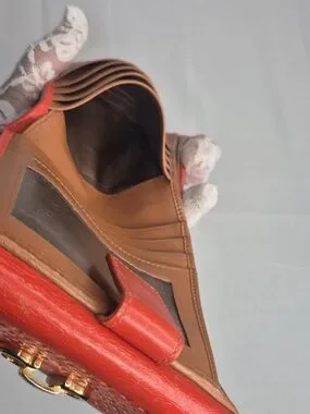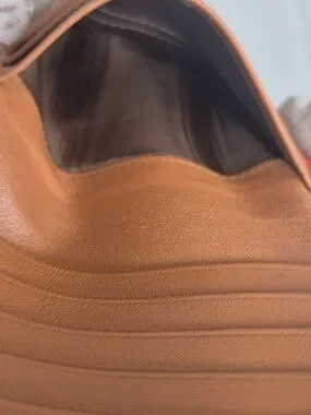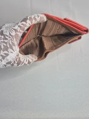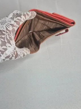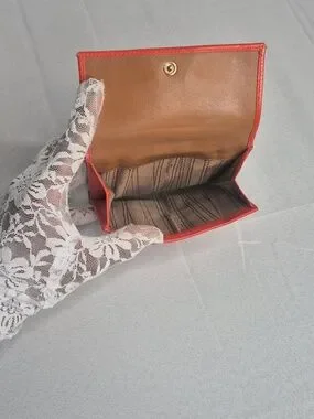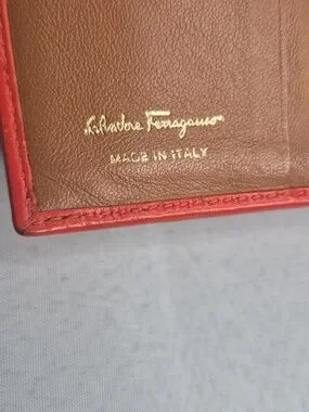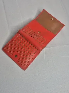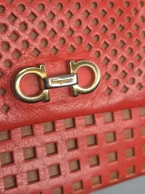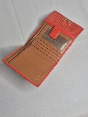 EUC Salvatore Ferragamo compact leather card wallet with perforated design. With Dust Bag. Features signature Gancio gold hardware. Smooth burnt orange hue for a lively look. Simple, chic, and easy to carry. Minor rubs. CHAIN STRAP NOT INCLUDED.