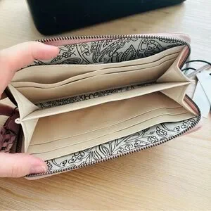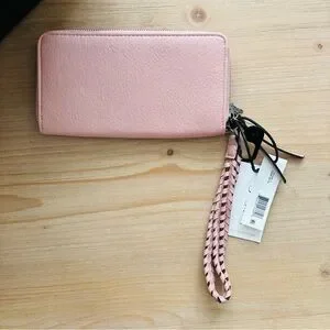 Chic blush pink wallet with elegant stitching. Features a stylish braided wrist strap. Ideal for daily essentials.