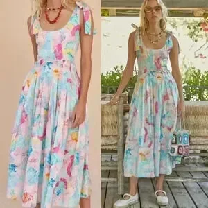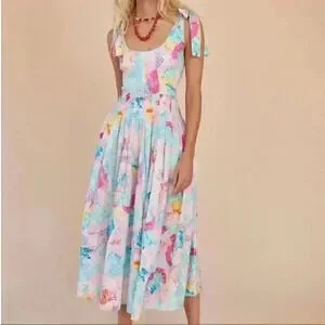 HUNTER BELL Pastel Floral Tie-Shoulder Scoop-Neck Midi Dress