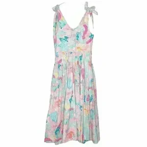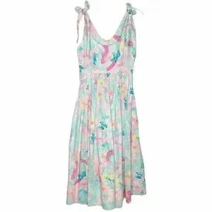 Sleeveless midi with tied shoulder straps. Scoop neckline and fitted bodice. Full pleated skirt with pastel floral print. Soft, airy look for daytime wear.